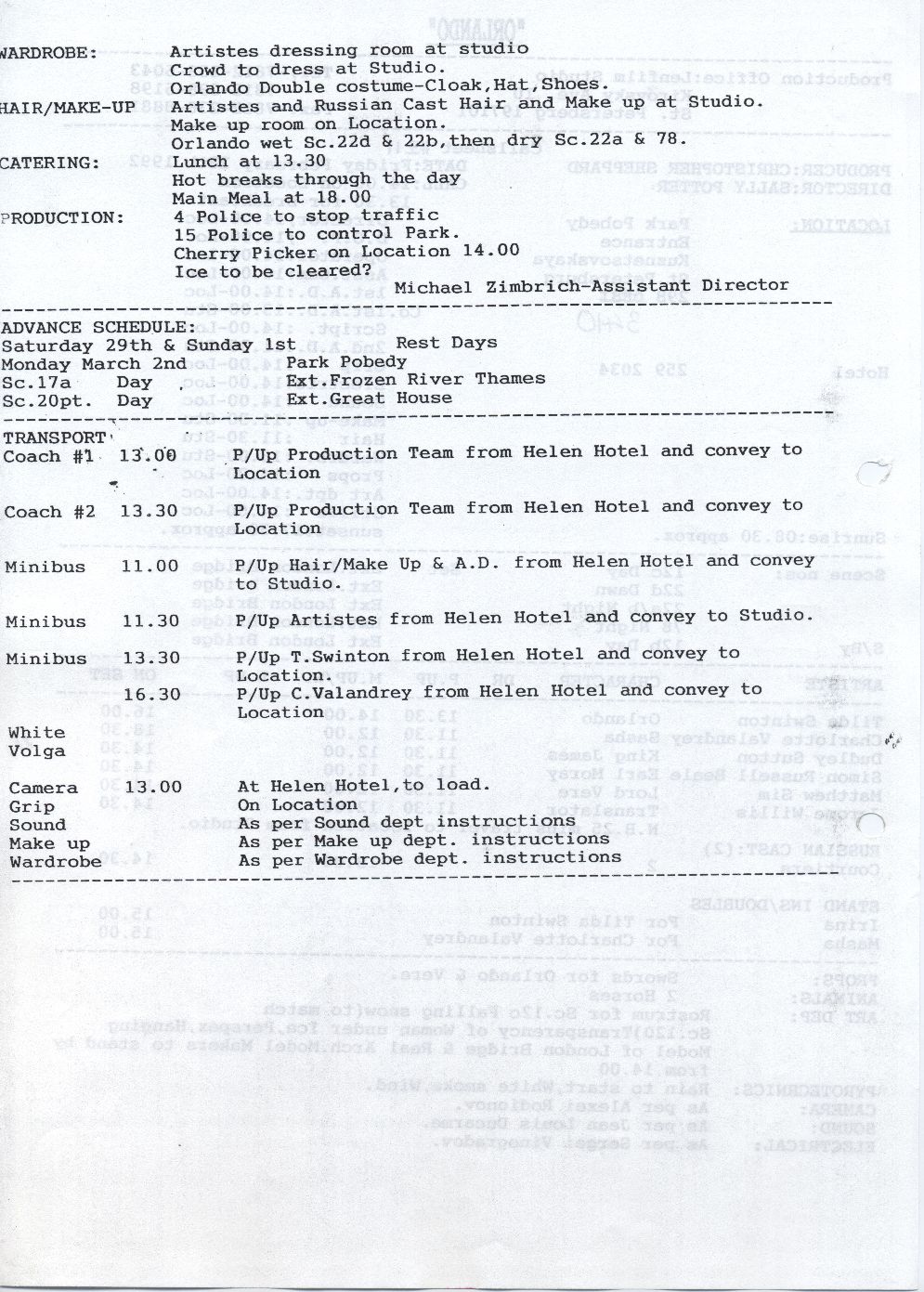 Description Reverse of production call sheet #11. Typed A4 sheet