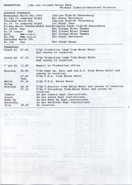 Description Reverse of production call sheet #13. Typed A4 sheet