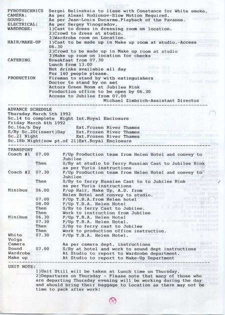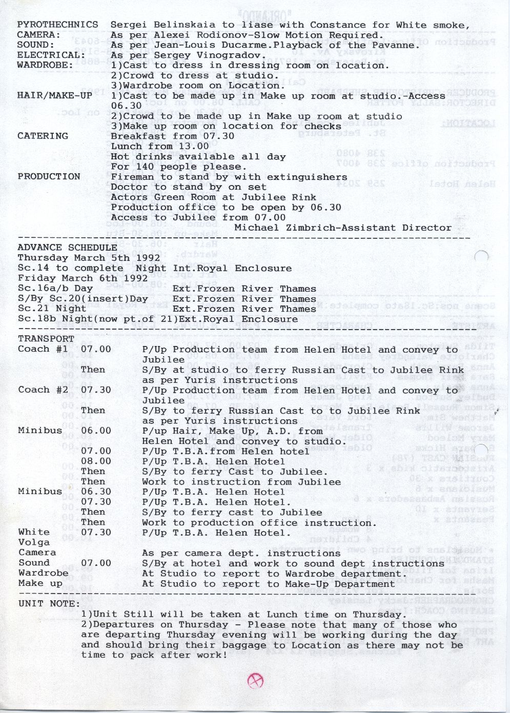 Description Reverse of production call sheet #14. Typed A4 sheet