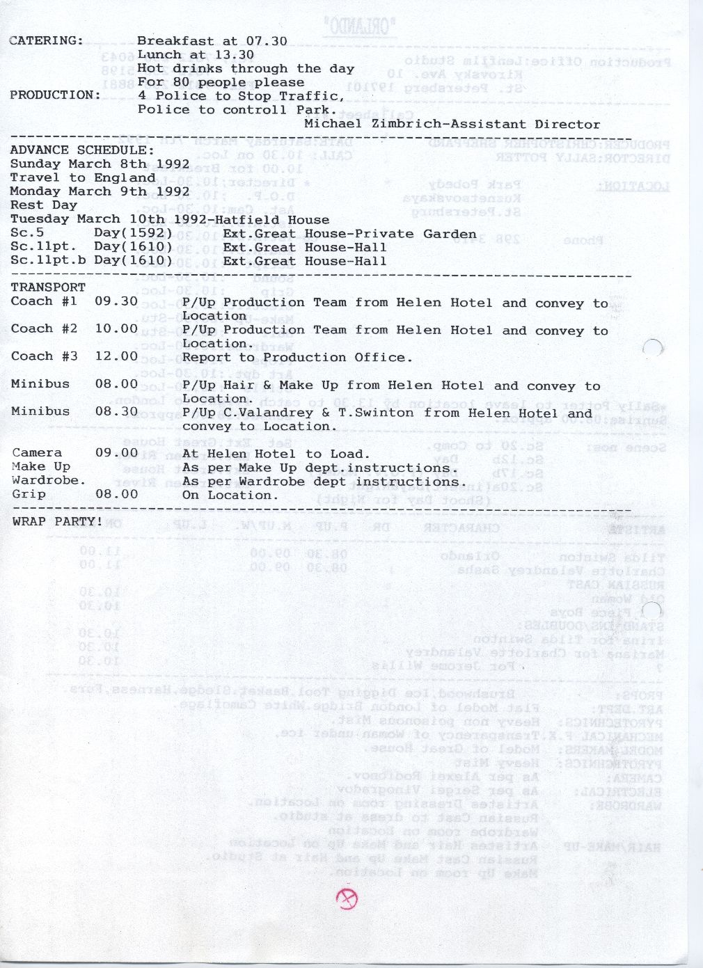 Description Reverse of production call sheet #17. Typed A4 sheet