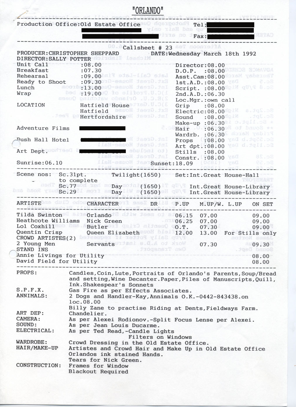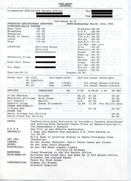Description Production call sheet #23. Printed A4 sheet.