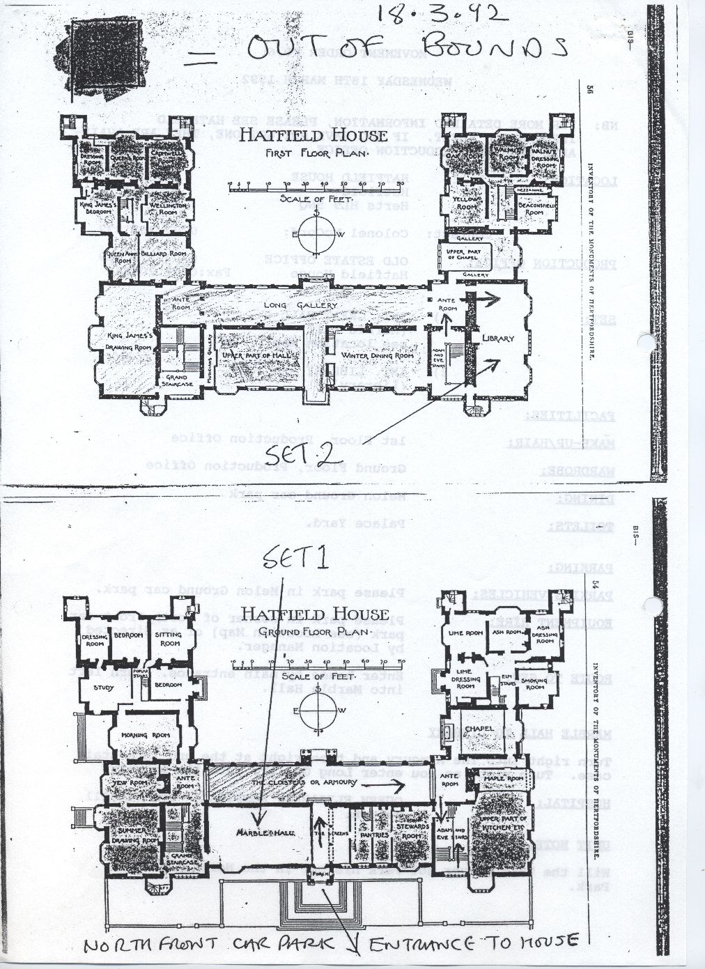 Description Photocopied plans of ground and first floor of Hatfield House with handwritten annotations