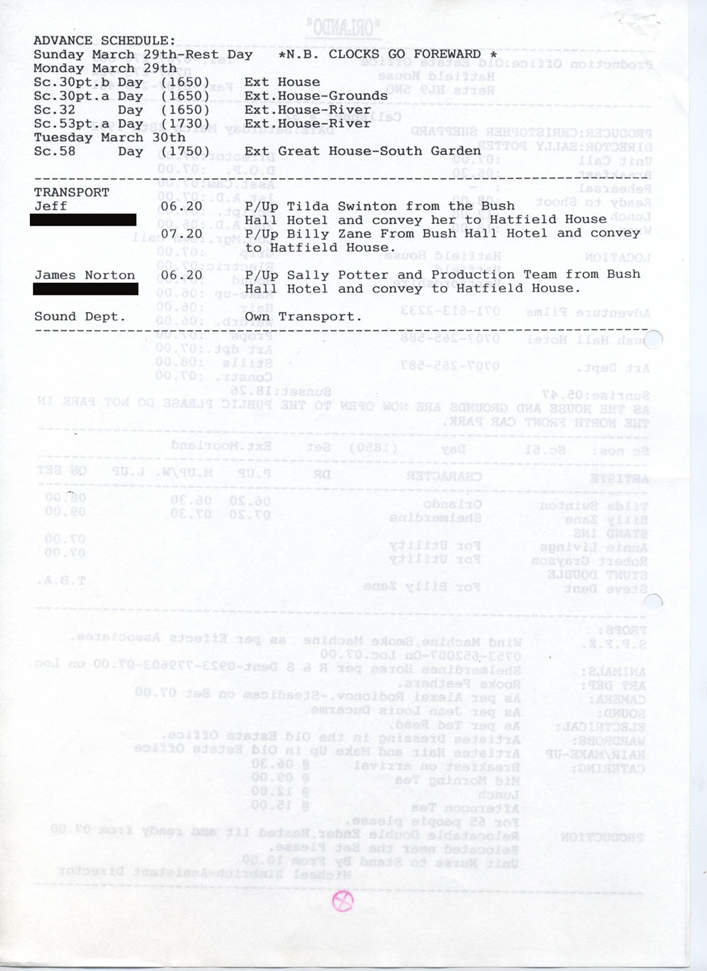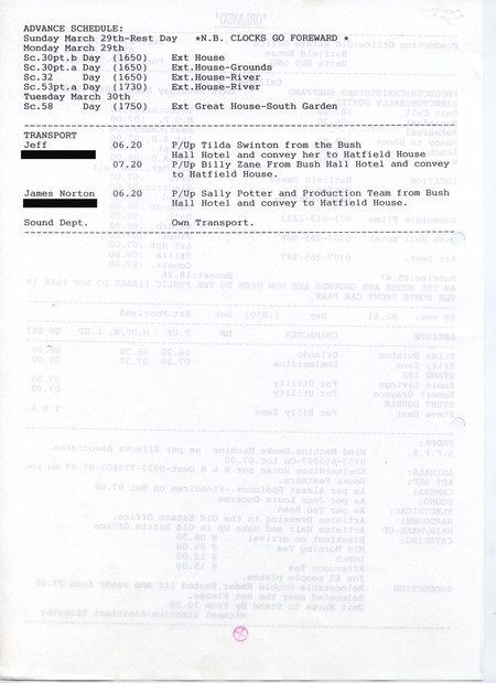 Description Reverse of production call sheet #32. Typed A4 sheet.