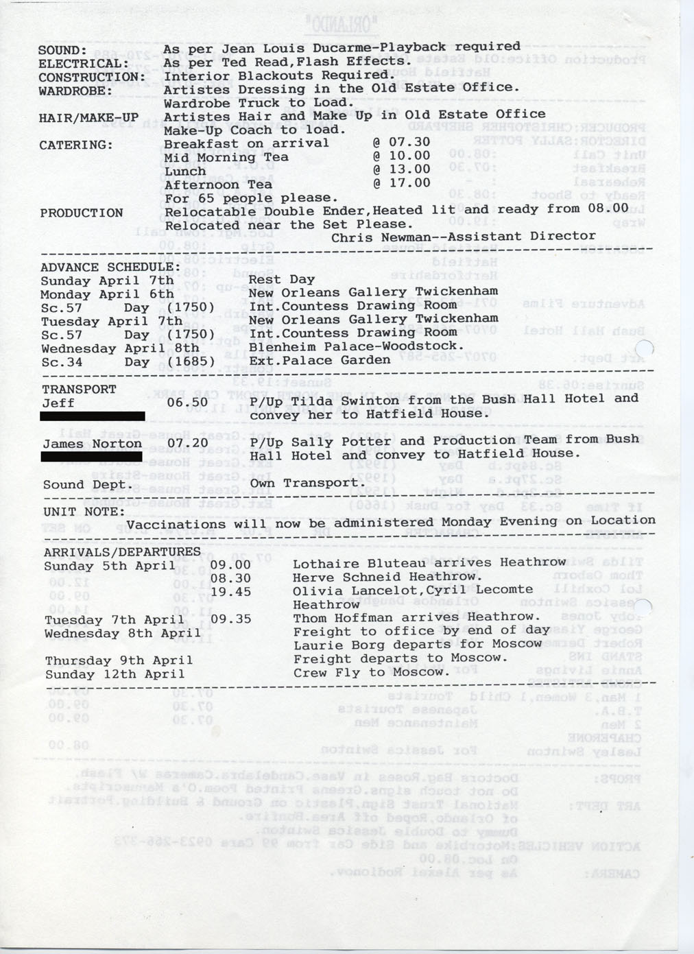 Description Reverse of production call sheet #38. Typed A4 sheet.