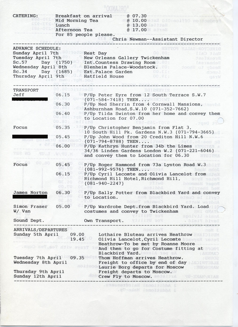 Description Reverse of production call sheet #39. Typed A4 sheet.