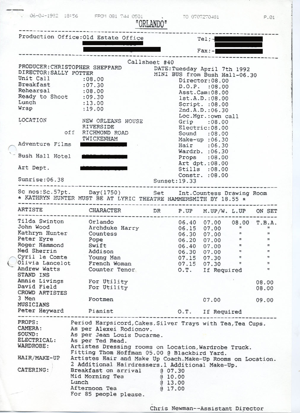 Description Production call sheet #40, page 1. Typed A4 sheet.