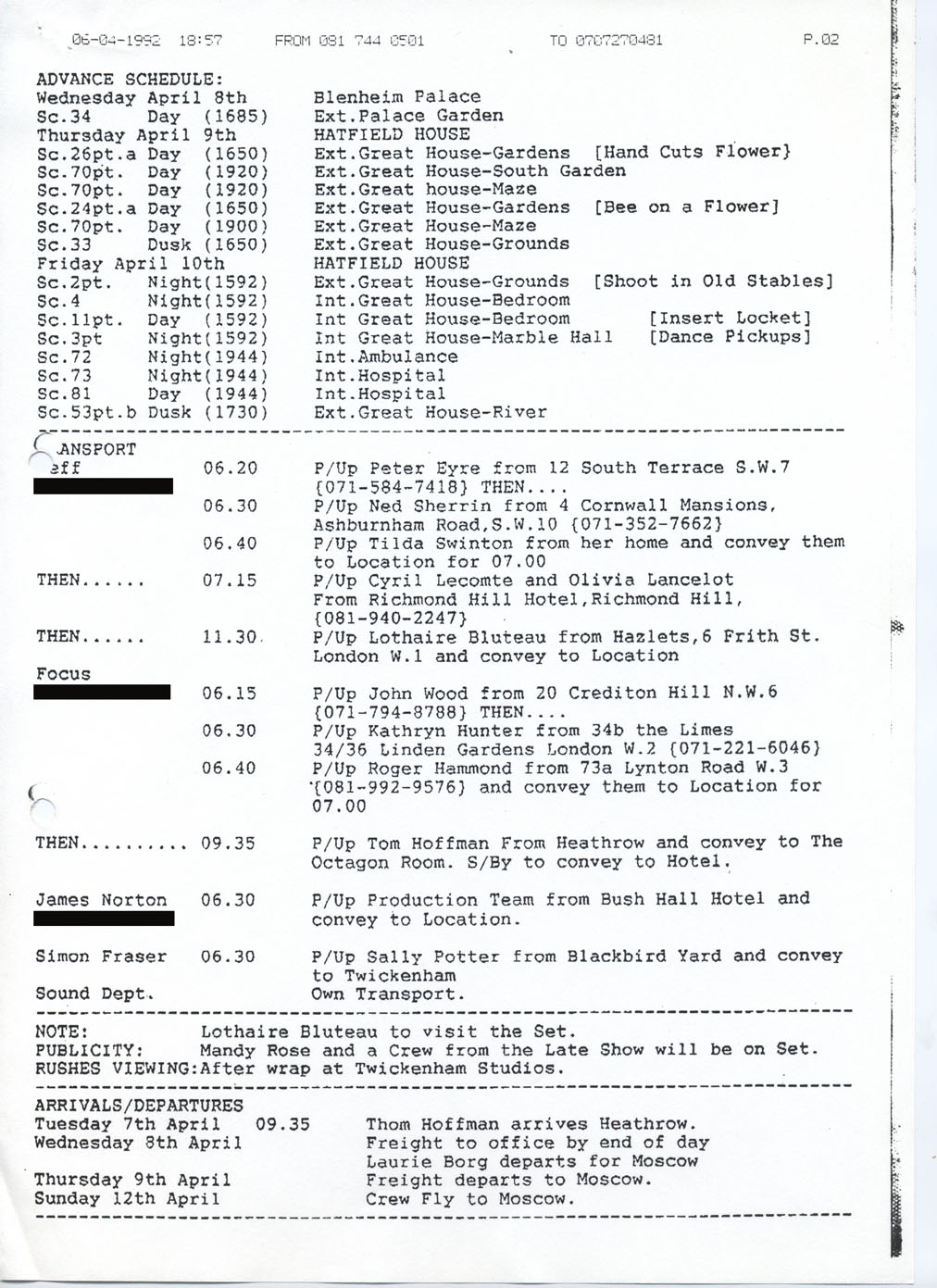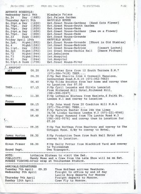 Description Production call sheet #40 page 2. Typed A4 sheet.