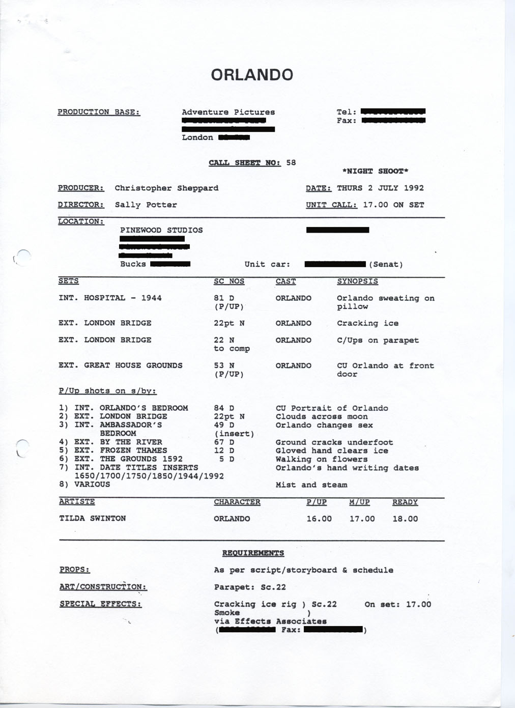 Description Production call sheet #58, page 1. Typed A4 sheet.