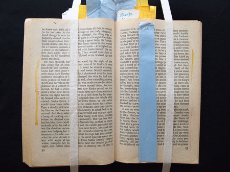 Description Original Novel, Page 32, yellow side highlight, page 33, yellow and red side highlight, blue bookmark "london"