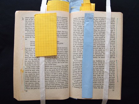 Description Original Novel, Page 36, yellow and green side highlight, page 37, green side line, yellow bookmark, blue bookmark "jealous (Othello)"
