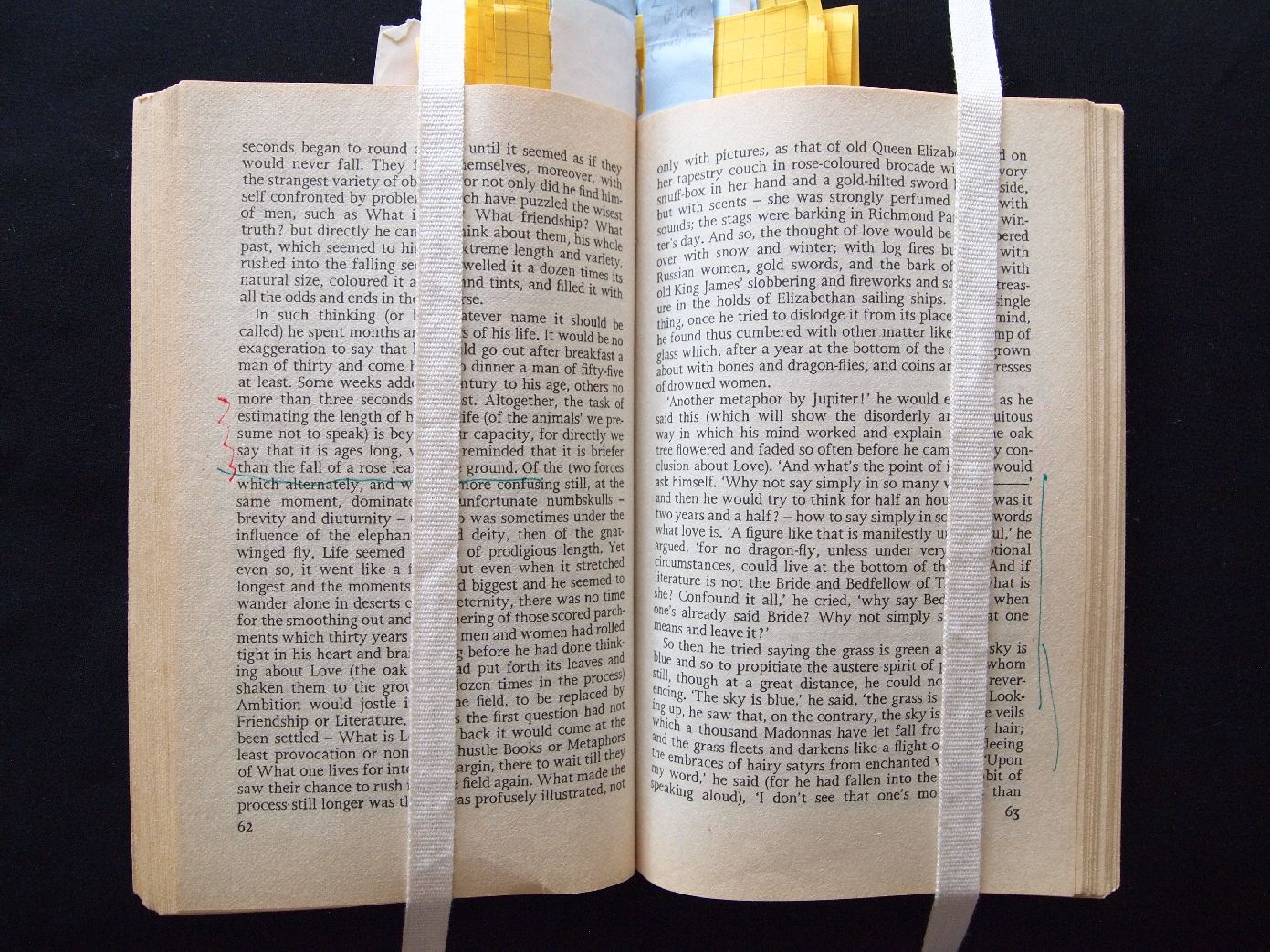 Description Original Novel, Page 62, green underline, red side line, page 63, green side line