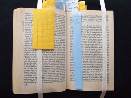 Description Original Novel, Page 118, yellow bookmark, pencil side line, page 119, blue bookmark