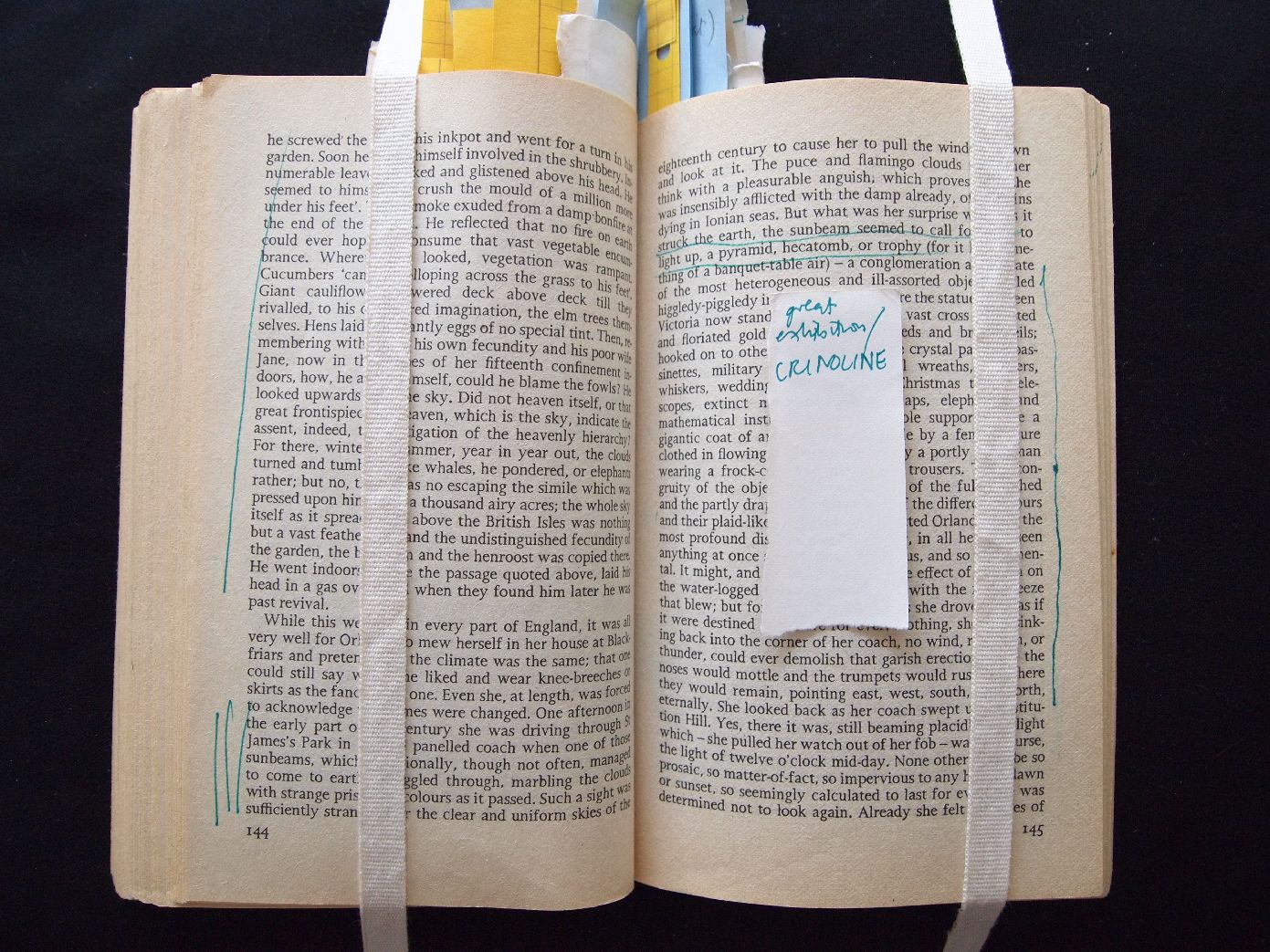 Description Original Novel, Page 144, green side lines, page 145, green underline and side line, white bookmark " Great exhibition…"