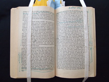 Description Original Novel, Page 154, green side lines and underlines, pencil underlines, page 155, green annotation and side lines and underlines, pencil underlines