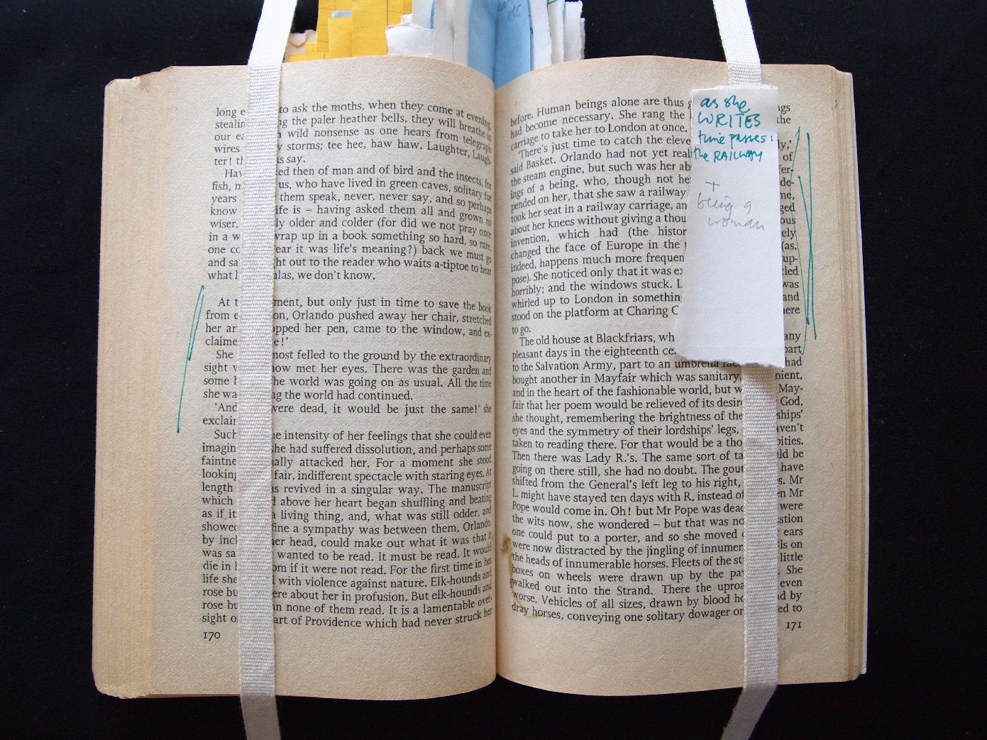 Description Original Novel, Page 170, green side line, page 171, green side line, white bookmark "as she writes…"