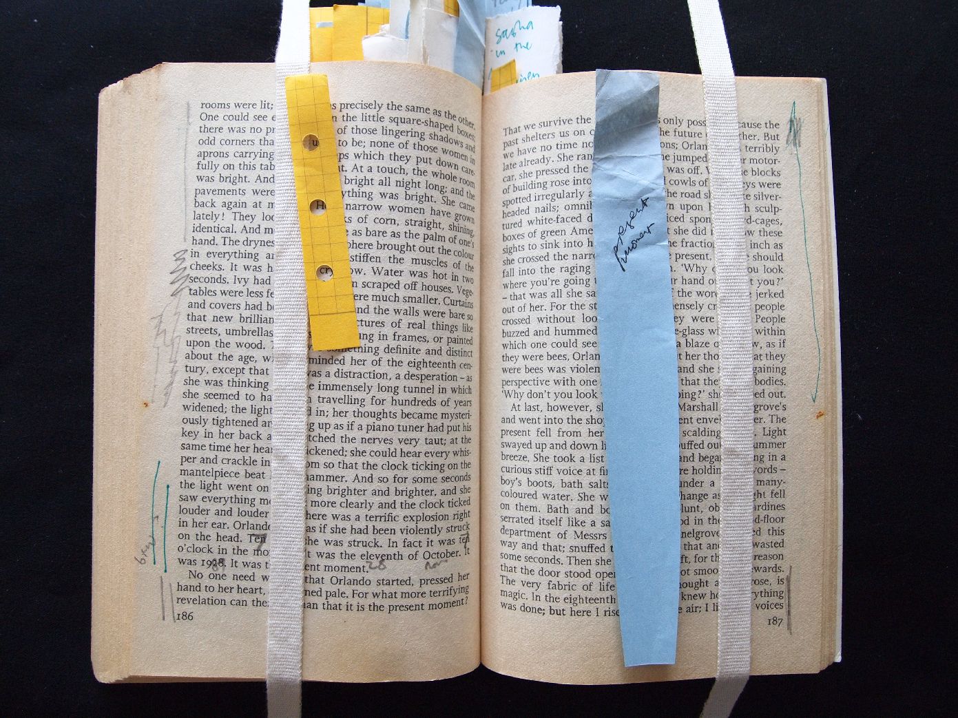 Description Original Novel, Page 186, green side line, pencil side line, yellow bookmark, page 187, green and pencil side lines, blue bookmark with black script writing