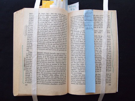 Description Original Novel, Page 192, pencil side lines, green side lines, page 193, green side line, blue bookmark "present moment…"