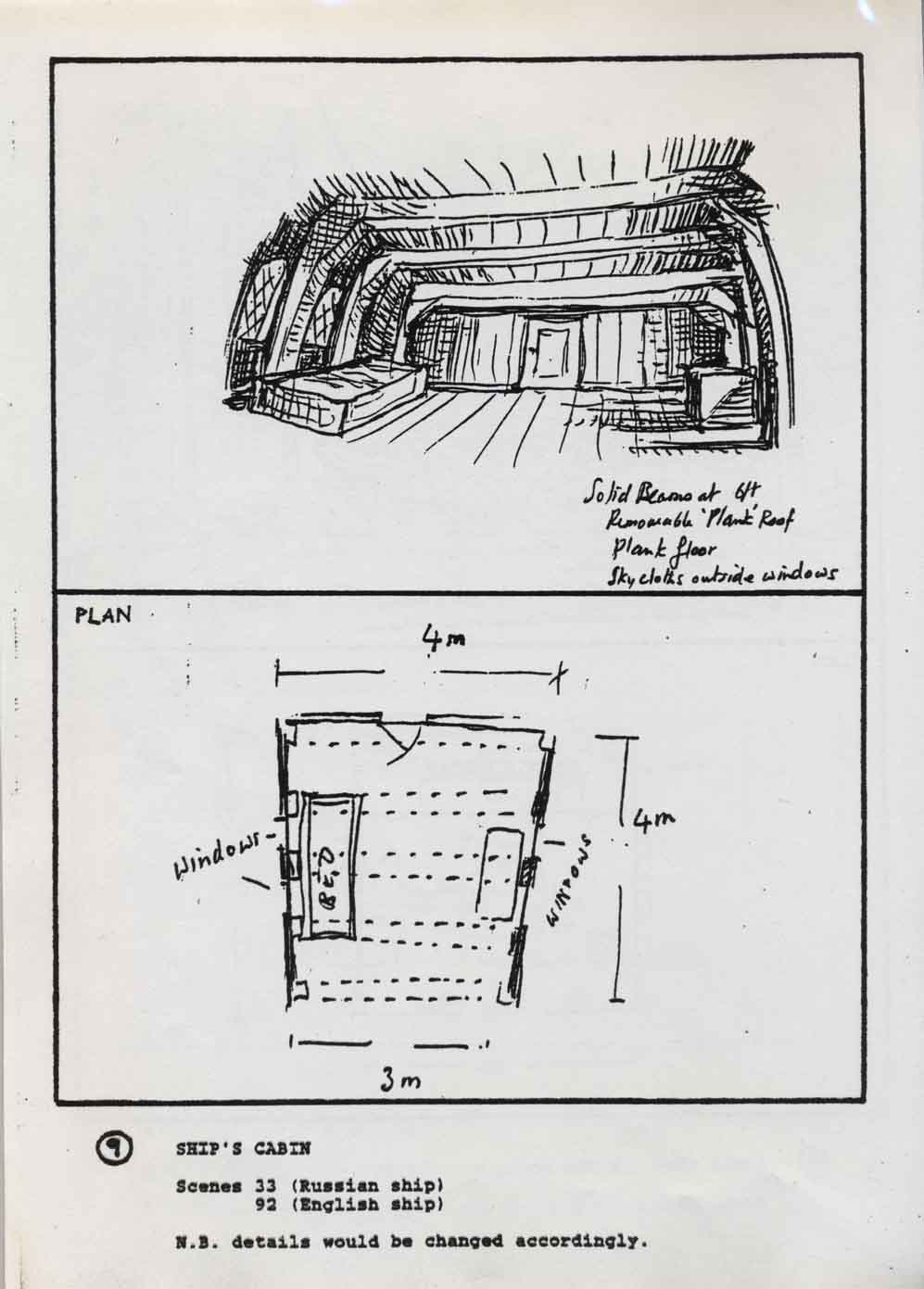 Description Page 9 of set design sketches showing ship's cabin. Black ink on white A4