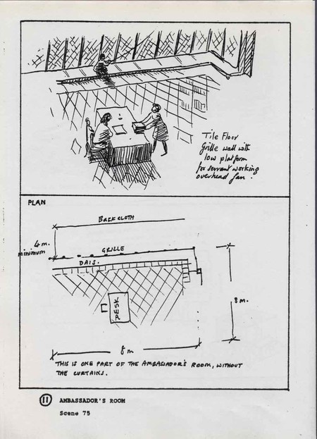 Description Page 11 of set design sketches showing the ambassador's room. Black ink on white A4