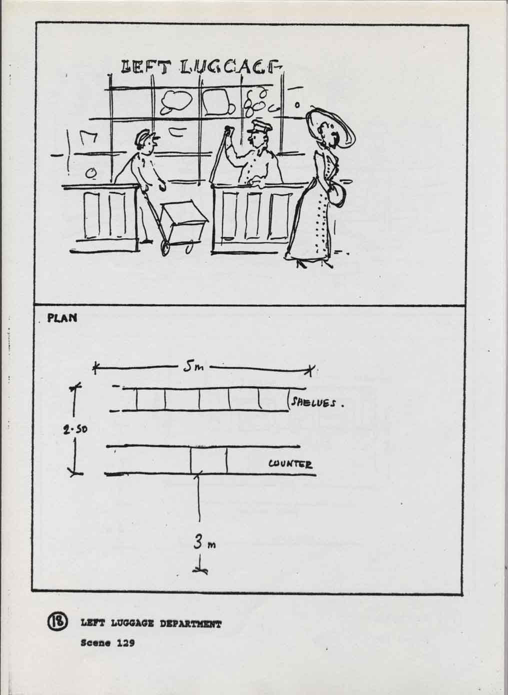 Description Page 18 of set design sketches showing left luggage department. Black ink on white A4