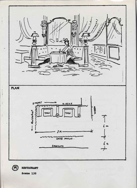 Description Page 19 of set design sketches showing restaurant. Black ink on white A4.