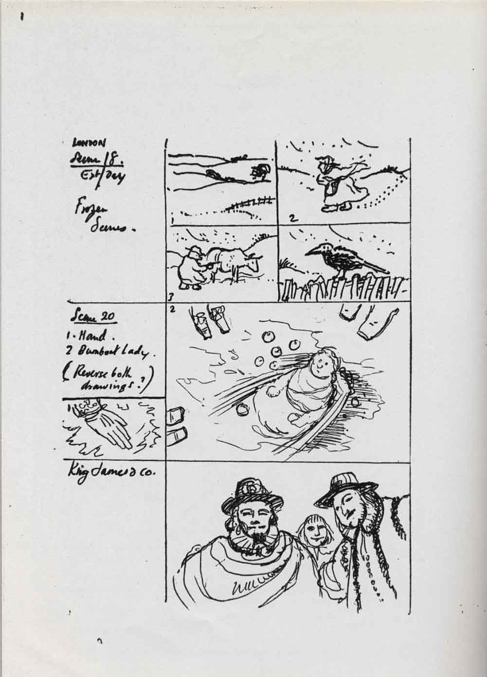 Description Page 1 of main sequence storyboards showing frozen London and King James, handdrawn in black ink on white A4.