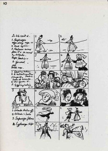 Description Page 10 of main sequence storyboards showing Euphrosyne, Orlando, giggling ladies, handdrawn in black ink on white A4.