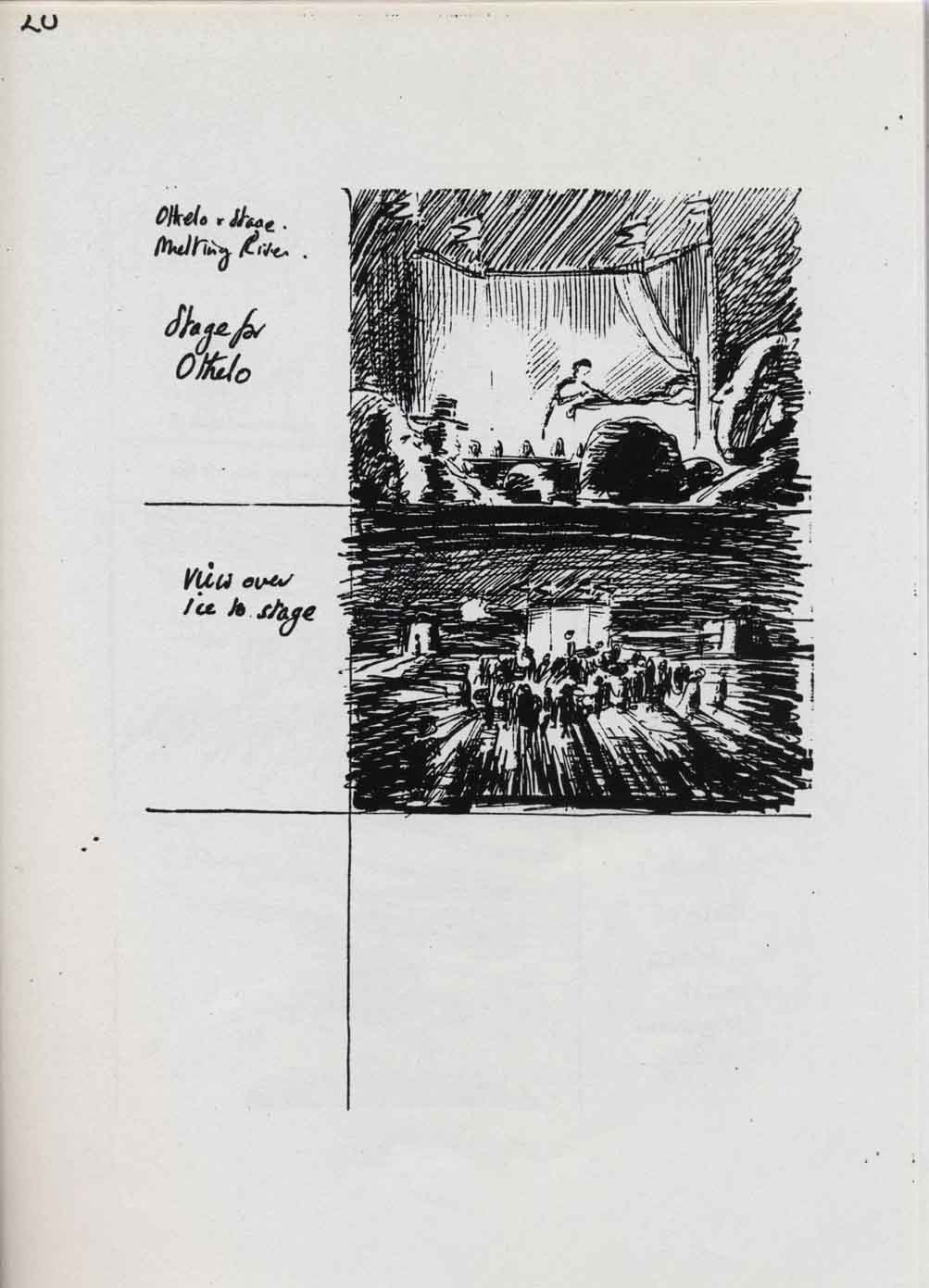 Description Page 20 of main sequence storyboards showing Othello and the view over the ice to the stage, handdrawn in black ink on white A4.