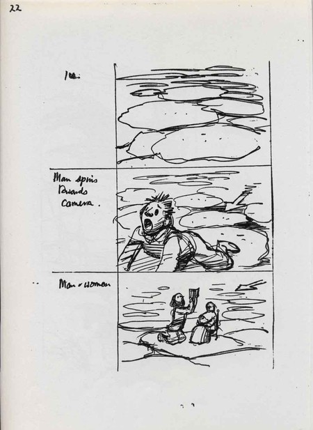 Description Page 22 of main sequence storyboards showing the results of the cracking frozen ice, handdrawn in black ink on white A4.