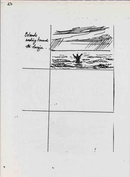 Description Page 25 of main sequence storyboards showing Orlando wading through the sea towards the horizen, handwritten in black ink on white A4.