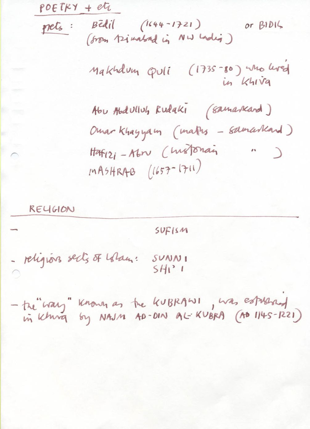 Description A4 pages, handwritten in pen, Paper, Notes on Khiva and Islam, handwritten