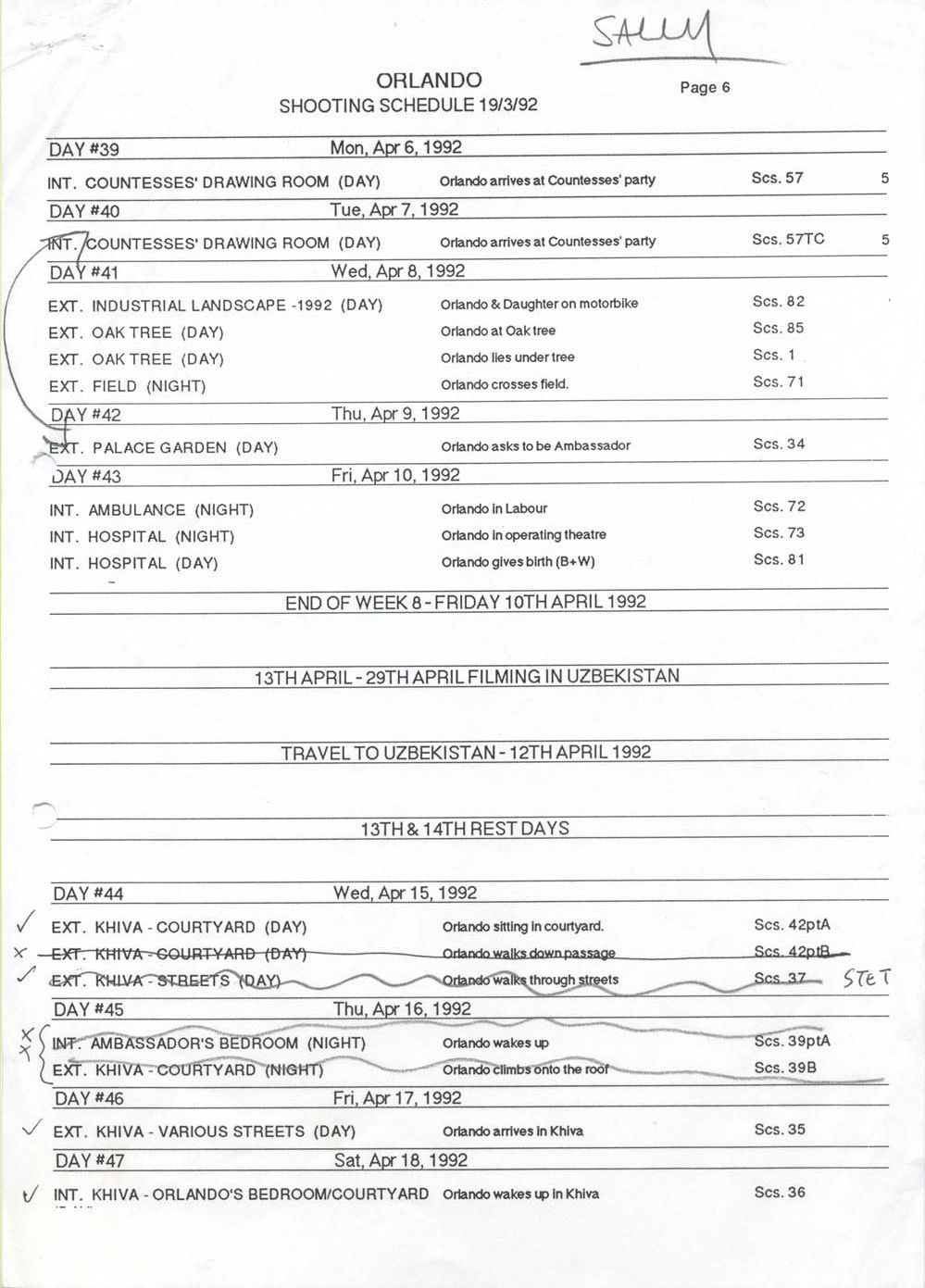 Description A4 computer paper with handwritten notes, Paper, One line shooting schedule, London, Khiva