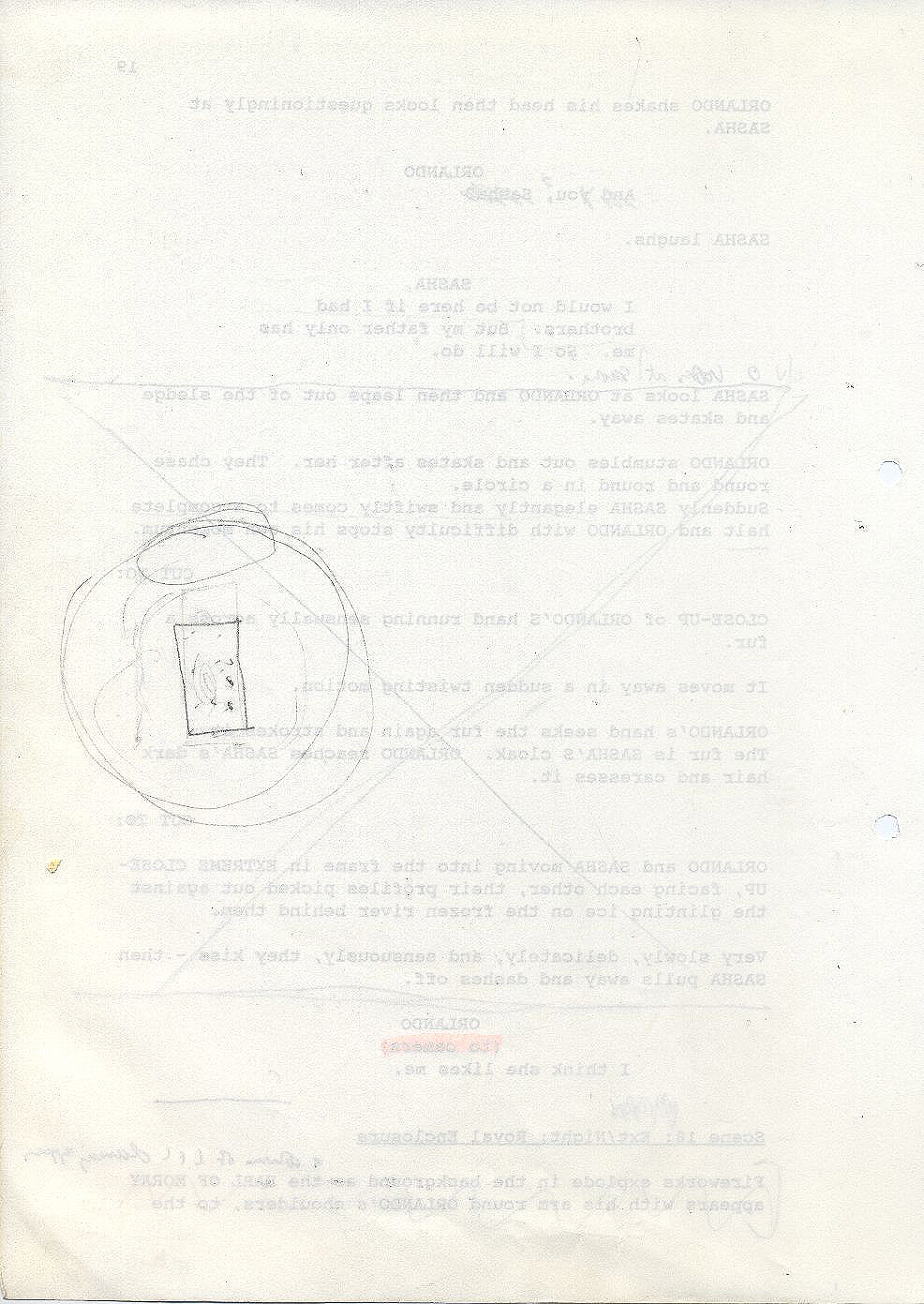 Description Black and white A4 computer printed with handwritten annotations, bound into book, Paper,Orlando Sally Potter’s Shooting Script page 19 back
