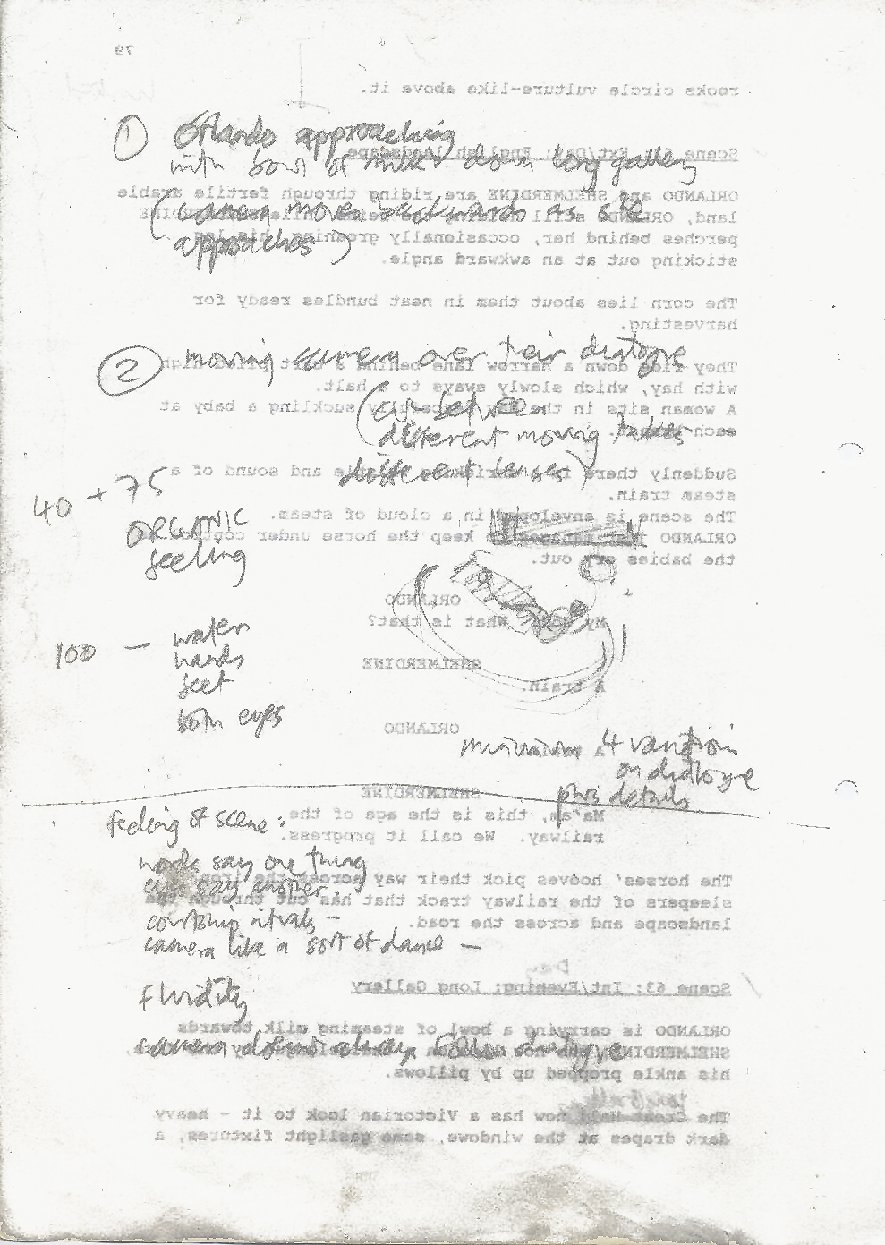 Description Black and white A4 computer printed with handwritten annotations, bound into book, Paper, Orlando Sally Potter’s Shooting Script page 79 back