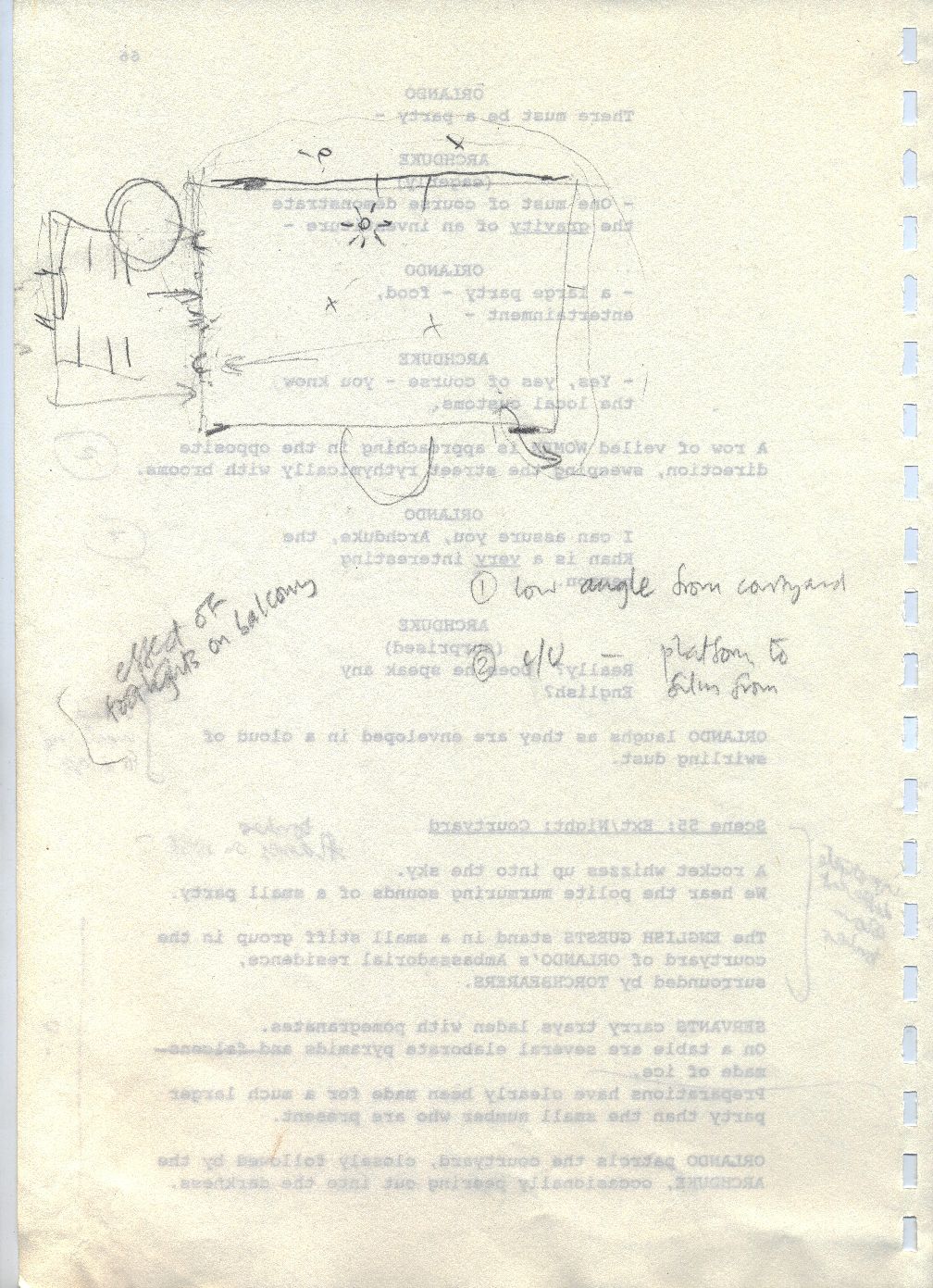 Description Revised draft script for Orlando, handwritten notes and diagrams in pencil, page 66, back