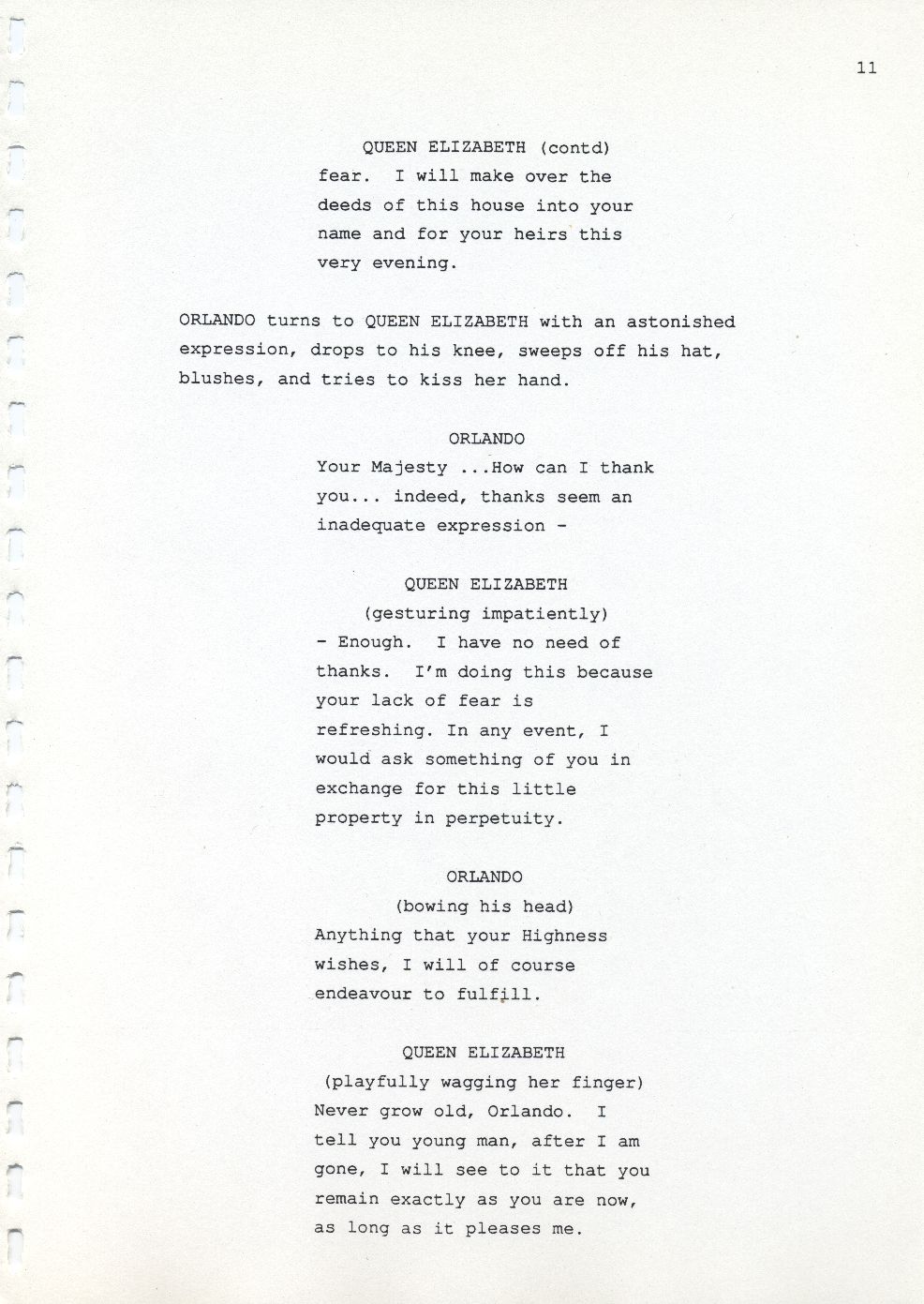 Description Page 11 of revised draft script for Orlando. Black printed text on A4 paper bound with a plastic comb spine