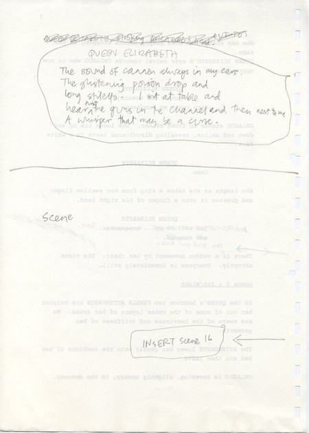 Description Reverse of page 7 of second draft script for Orlando. Handwritten scene in pencil on A4 paper bound with a plastic comb spine