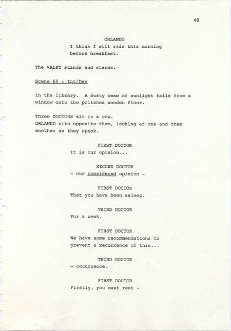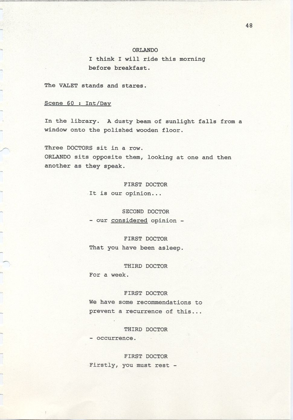 Description Page 48 of second draft script for Orlando. Black printed text on A4 paper bound with a plastic comb spine