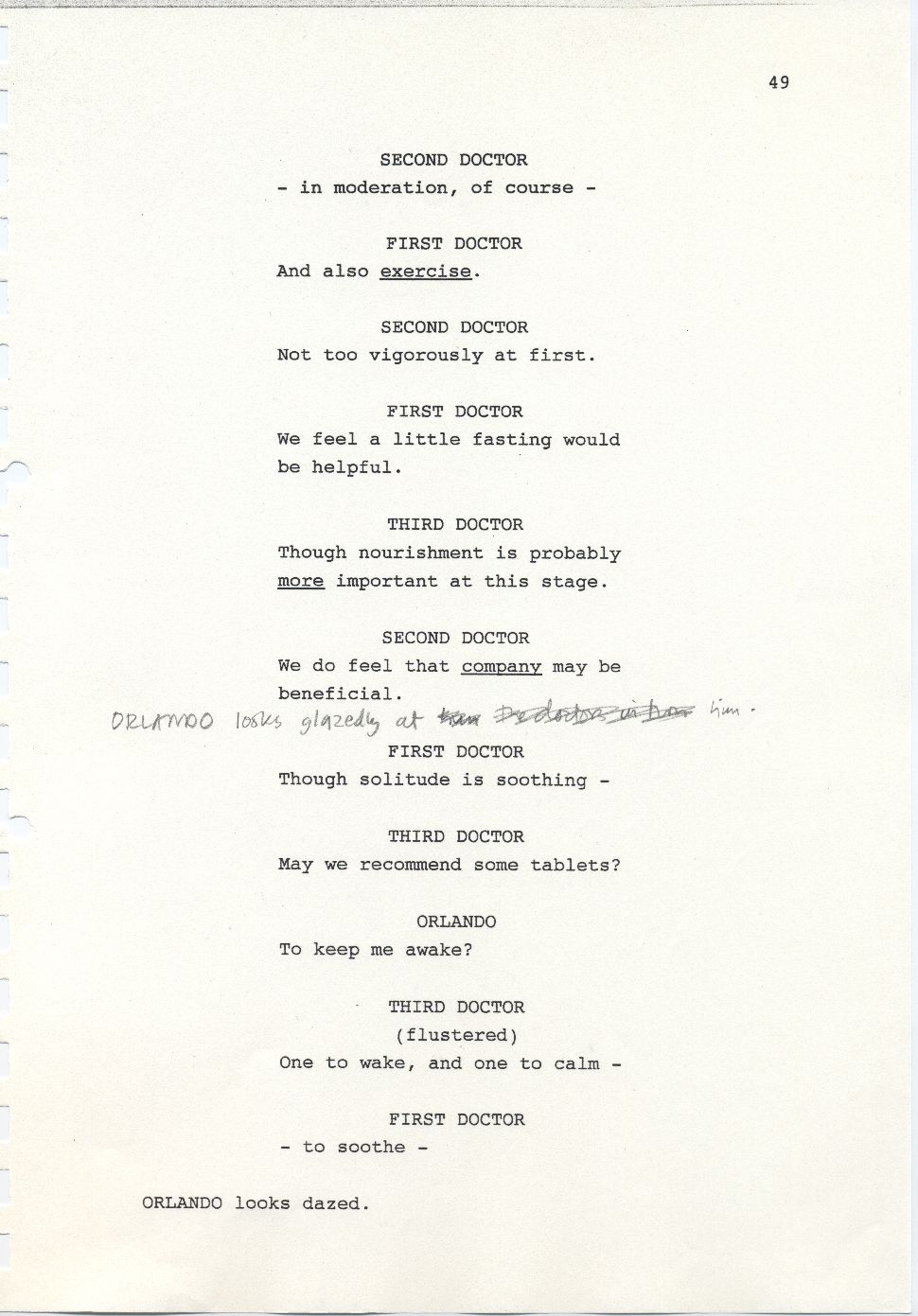 Description Page 49 of second draft script for Orlando. Black printed text with pencil annotations on A4 paper bound with a plastic comb spine