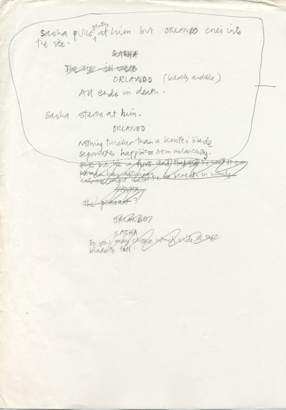 Description Loose page of A4 with dialogue written in pencil, between page 50 and 51 of second draft of Orlando script