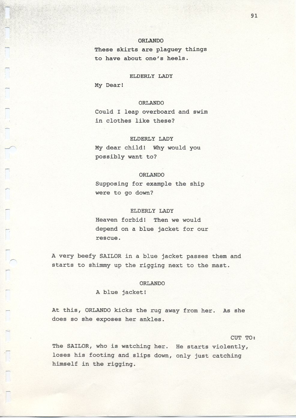 Description Page 91 of second draft script for Orlando. Black printed text on A4 paper bound with a plastic comb spine.