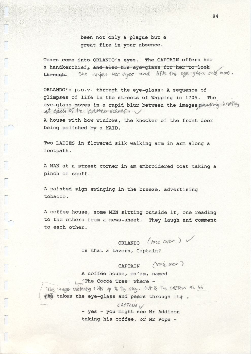 Description Page 94 of second draft script for Orlando. Black printed text with pencil annotations on A4 paper bound by a plastic comb spine.