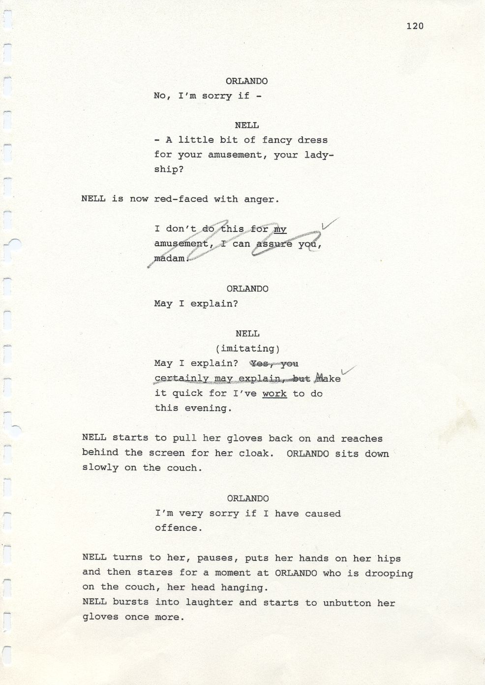 Description Page 120 of second draft script for Orlando. Black printed text with pencil annotations on A4 paper bound with a plastic comb spine.