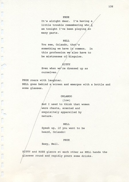Description Page 126 of second draft script for Orlando. Black printed text with pencil annotations on A4 paper bound with a plastic comb spine.