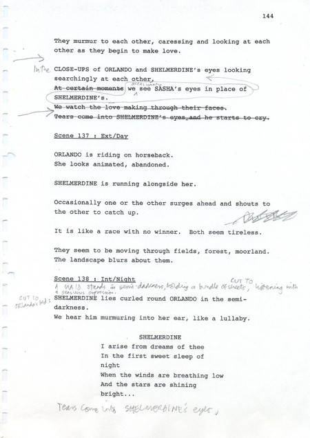 Description Page 144 of second draft script for Orlando. Black printed text with pencil annotations on A4 paper bound with a plastic comb spine.