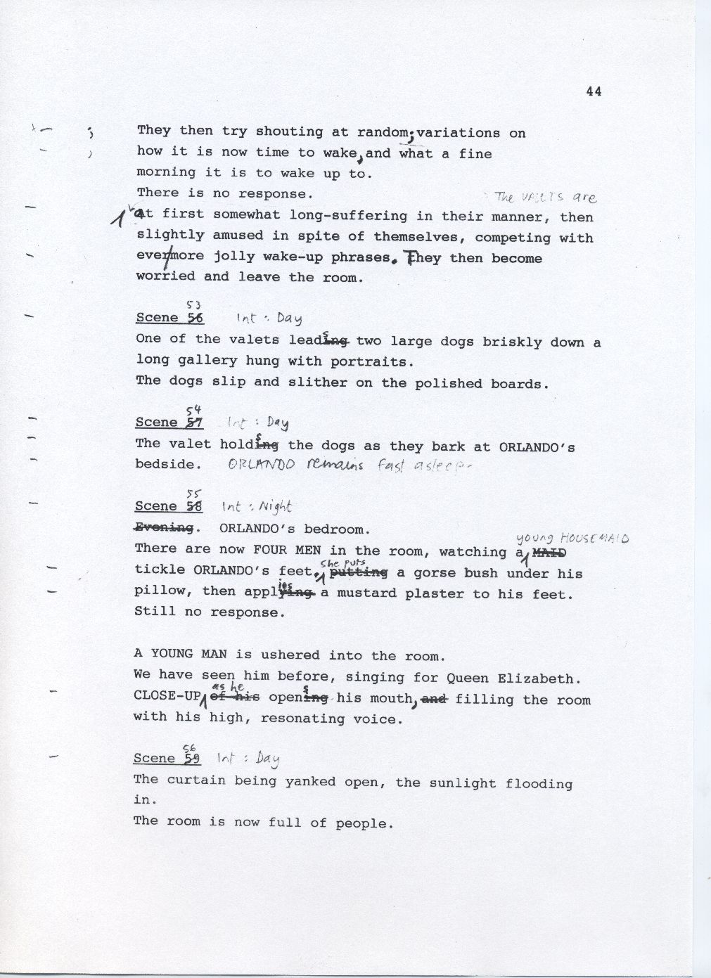 Description Page 44 of rough draft of scene 52, scene 53, scene 54, scene 55, scene 56. Black text on white A4 with pen annotations.