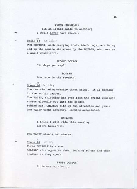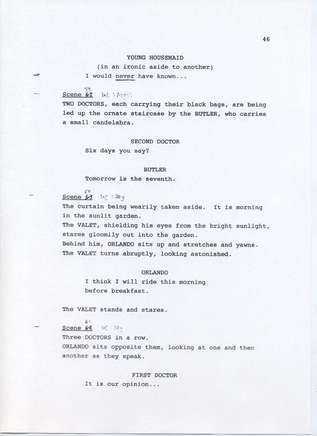 Description Page 46 of rough draft of scene 58, scene 59, scene 60, scene 61. Black text on white A4 with pen annotations.