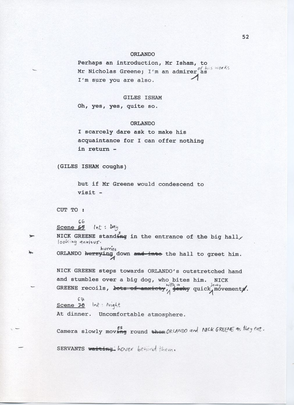 Description Page 52 of rough draft of scene 65, scene 66, scene 67. Black text on white A4 with pen annotations.