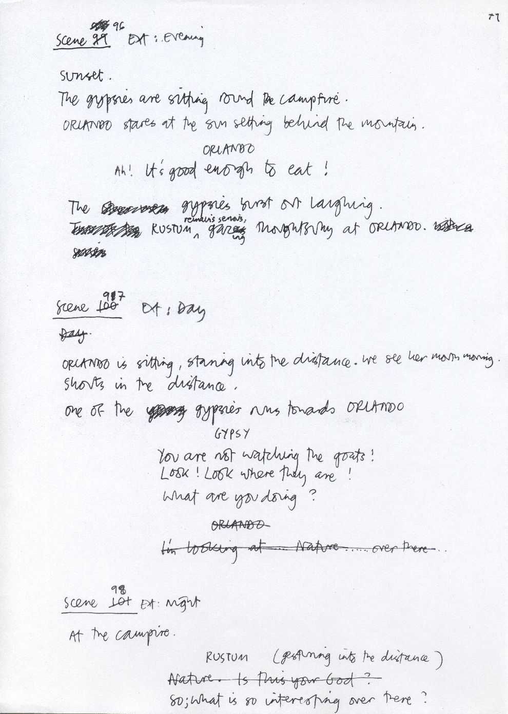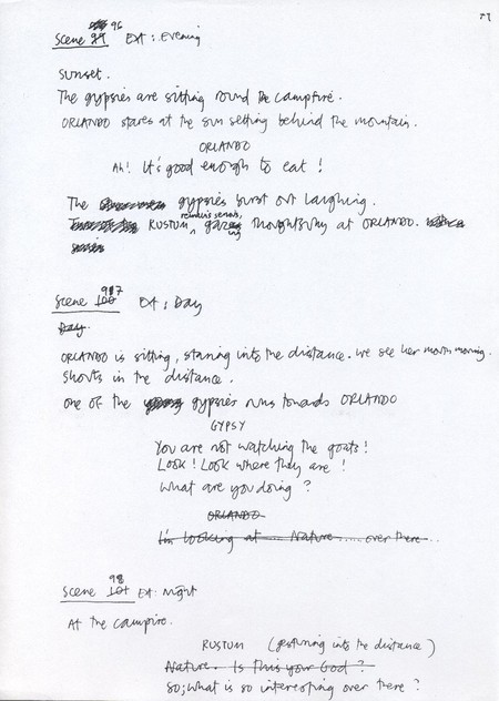 Description Page 79 of rough draft of scene 96, scene 97, scene 98. Hand written in black ink on A4 with pen annotations.