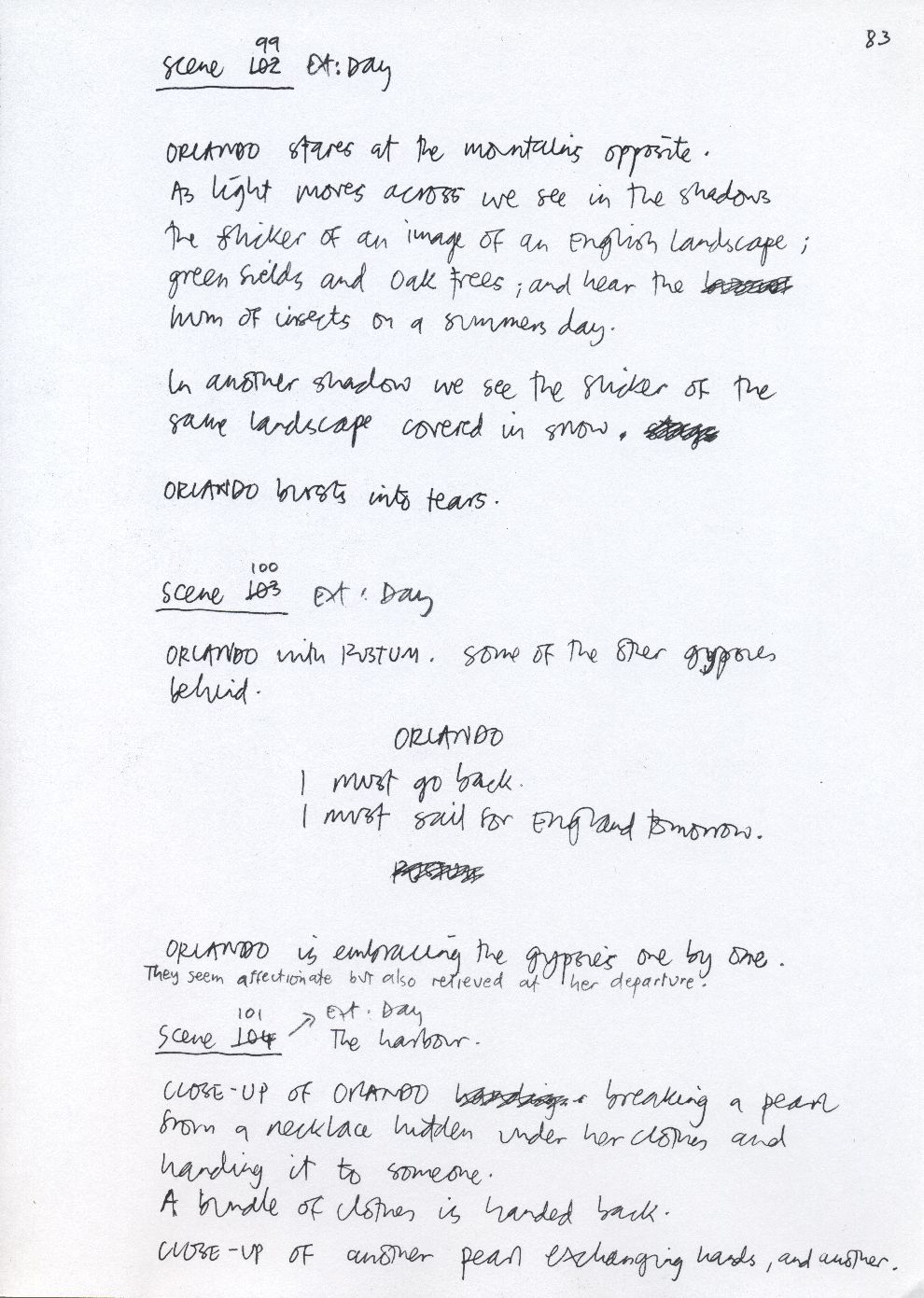 Description Page 83 of rough draft of scene 99, scene 100, scene 101. Hand written in black ink on A4 with pen annotations.